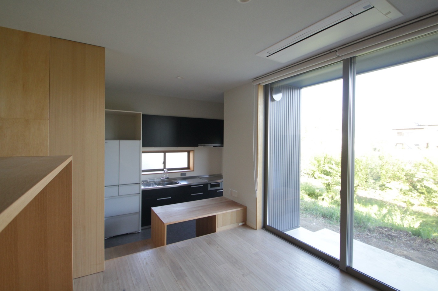 Sさん家族の食事や団らんは座卓。40cm下げられたキッチンに立つと、ダイニングやリビングに座っている家族と目線の高さがちょうど同じになるようにした。キッチンにあるカウンターは、食事の時間がバラバラな忙しい朝に朝食を食べるのに便利である。椅子が必要ないので空間がスッキリし、掃除も楽になる。また配膳も楽である。Sさんのパソコン作業台としても想定して設計した。