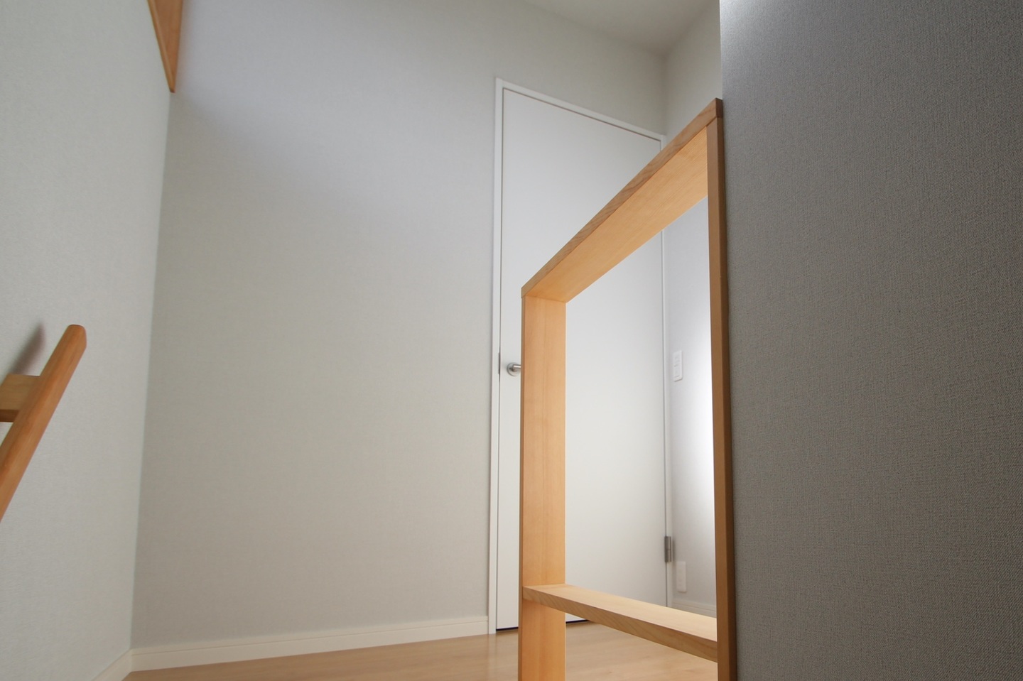 室内は外観とは相反して、落ち着いた柔らかい印象を好まれ、床や家具、建具は主にナラ材を使用している。床から天井までの南側の大きめのサッシ、玄関とリビングのガラスの間仕切りは、陽の光を部屋の隅まで届け、室内を明るい印象にしている。リビング南側のサッシ上にはバルコニーがあり庇の役目をしているので、真夏の強い日差しを和らげている。