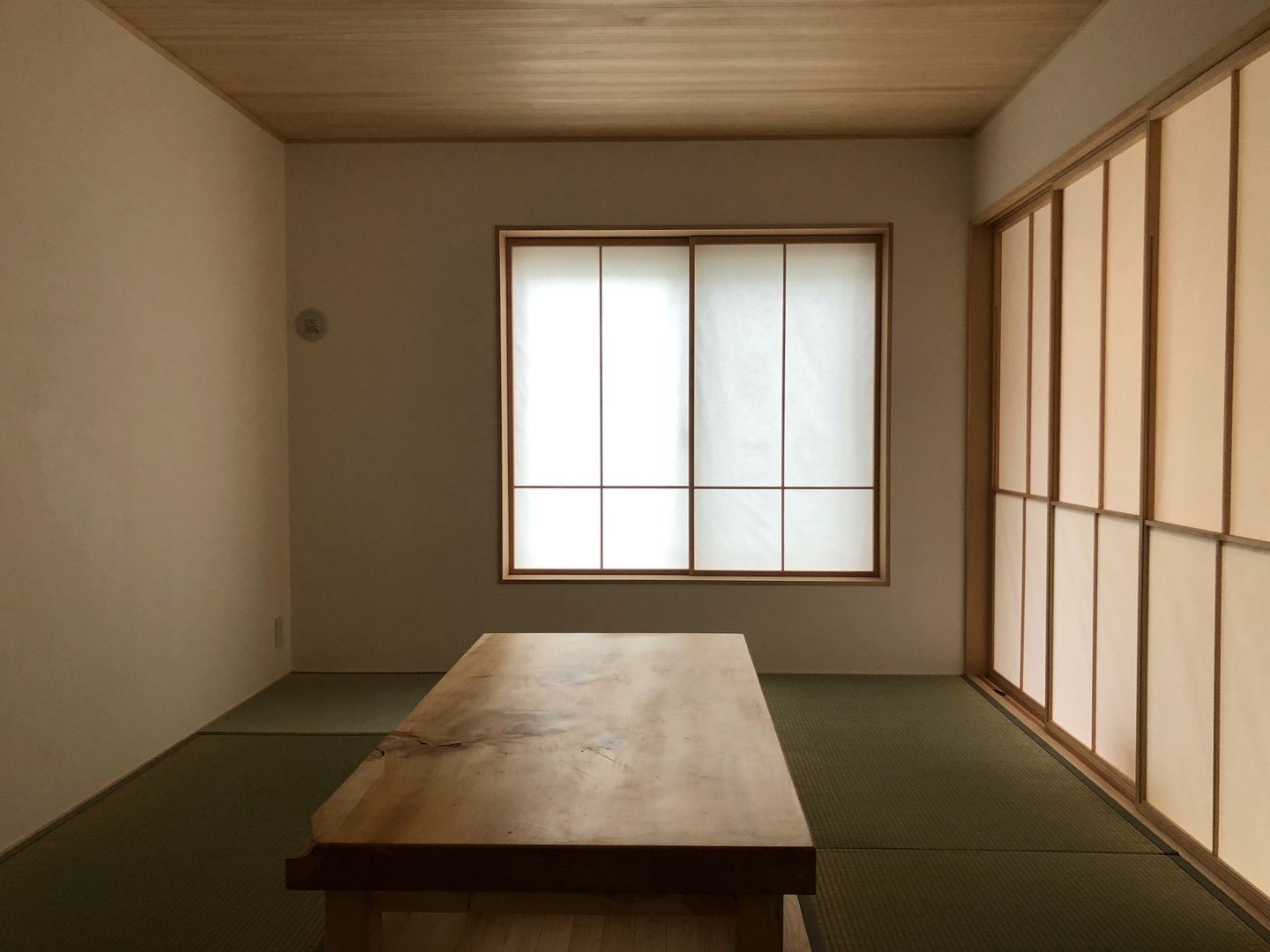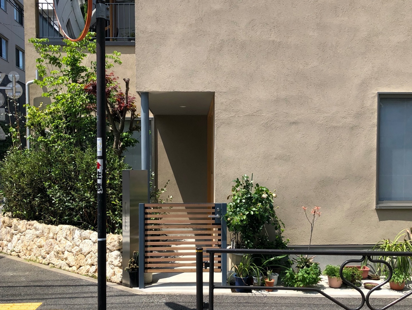 その庭と建物の間を通り、大きなガラス引き戸のある1階の玄関へとつながる。1階は「お母様の住まい」と「約10畳の和室」がある。この和室は親族の集まり、お母様の友人たち集まりにも使用されていて、大きめの玄関から直接和室に入ることができる。ちょっとした話であれば、玄関の踏み板に腰掛け、庭を眺めたりもでき、縁側のような雰囲気でもある。
