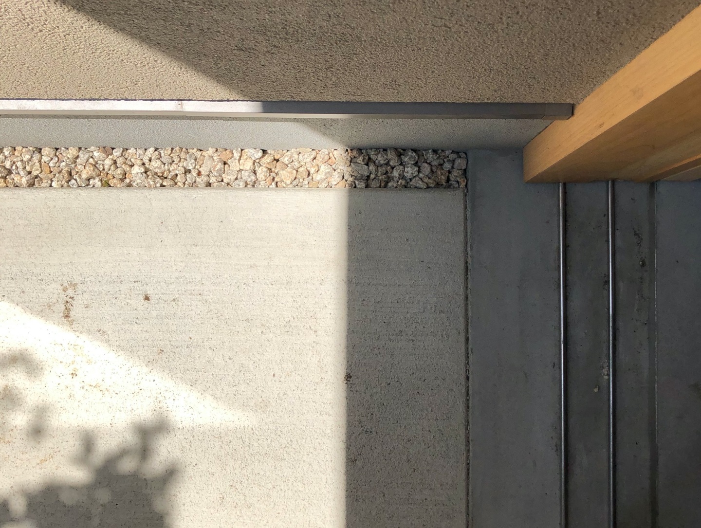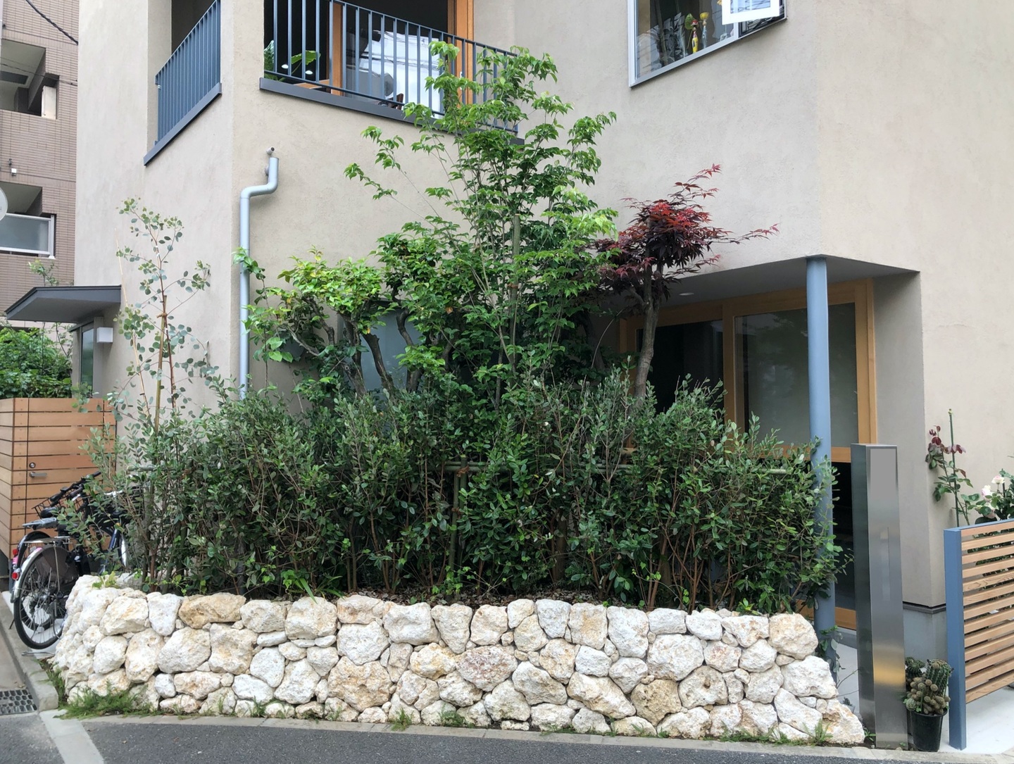「低めの石塀」と「程よく視界を遮るフェイジョアの生垣」は道路との境界を緩やかに分けている。石垣はKさん夫妻の好きな沖縄から着想を得て、現地から直送された琉球石灰岩の石積みとした。植栽はKさんと農園に一緒に行きフェイジョアの他、蝋梅、ヤマボウシ、ユーカリポポラスなどの選定を行い、旧宅にあったモミジ、サルスベリ、ツバキは移植した。その他にも、ウキツリボク、ヤマアジサイ、メギ、ウエストリンギアなどを植え、四季を通じて花が楽しめるようになっている。これら庭の設計はランドスケープデザインも得意とする若竹吉田建築設計事務所と共に行った。