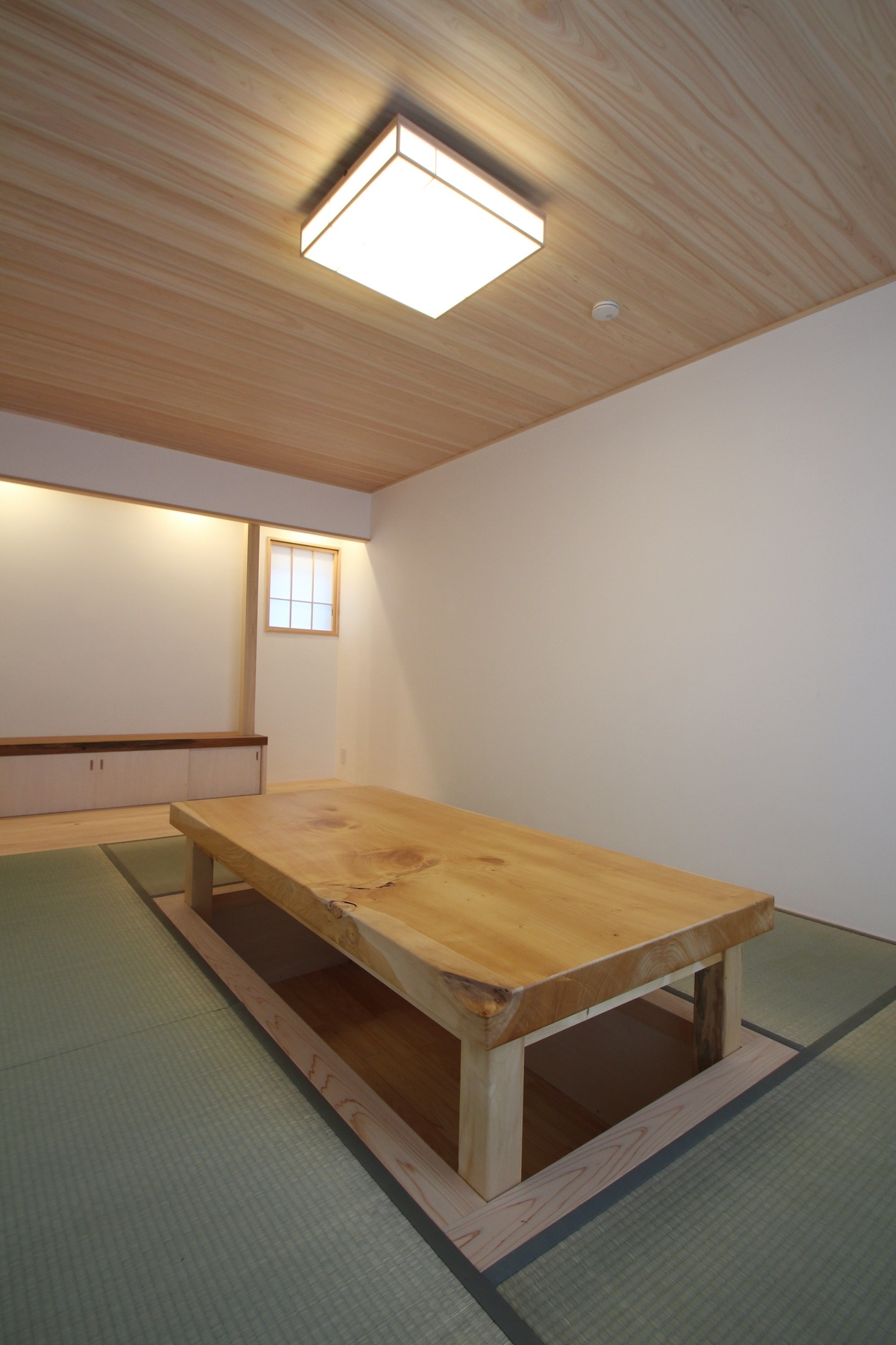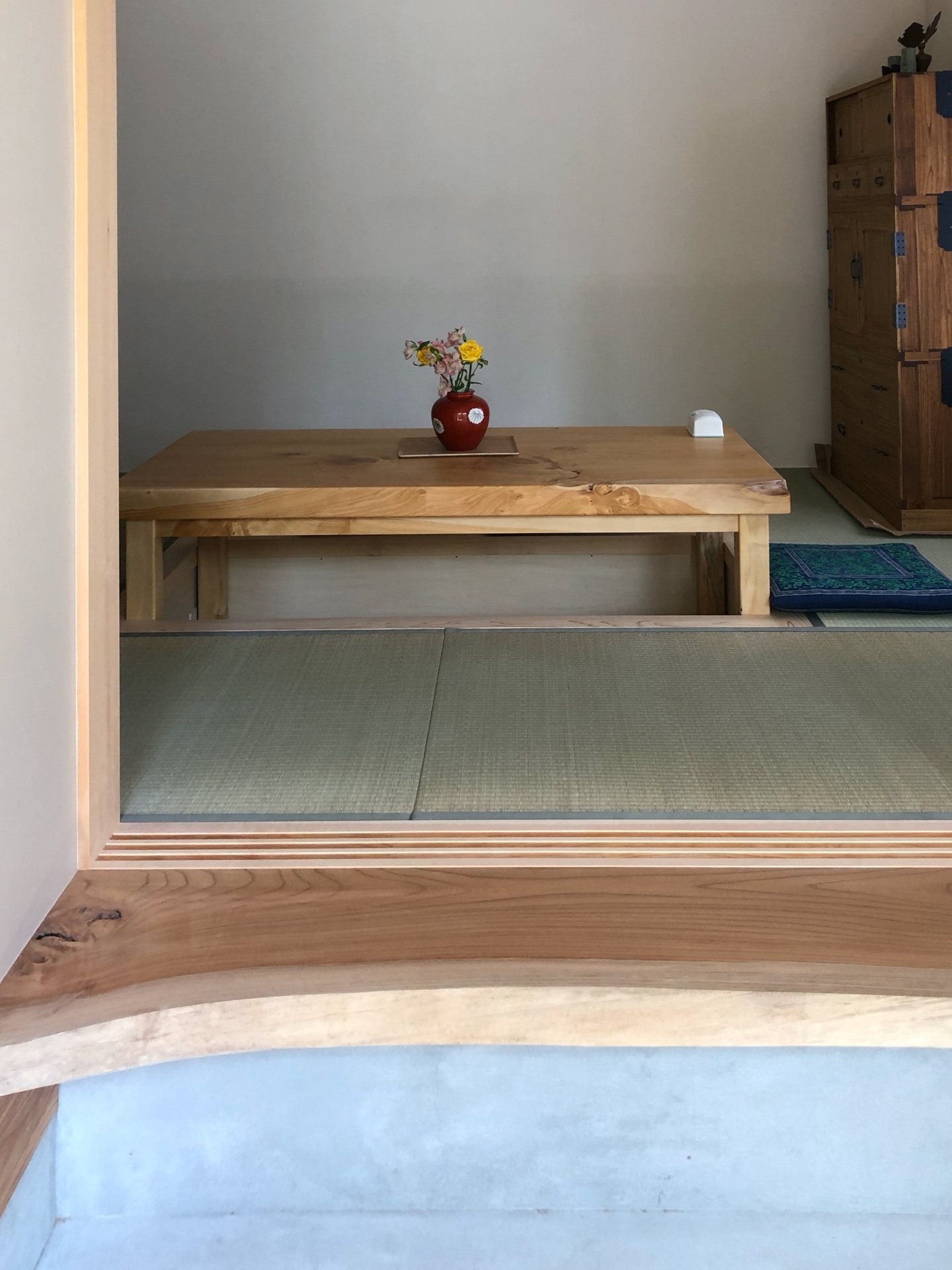 和室の掘りごたつは銀杏の一枚板だ。施工をお願いしたかしの木建設さんの工場に、お抱えの無垢の板があり、Kさん夫婦と一緒に色々見せていただいて選んだものだ。