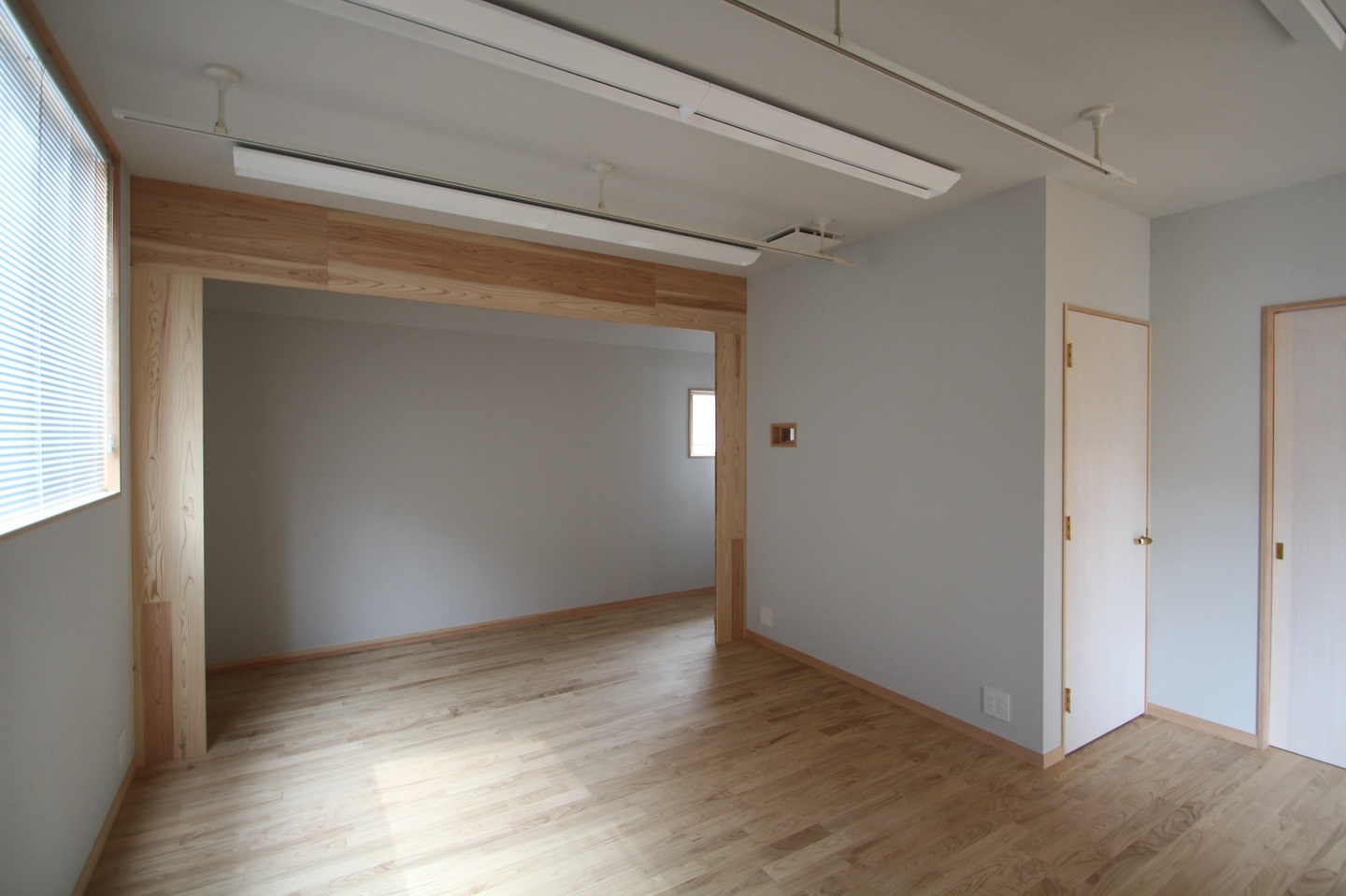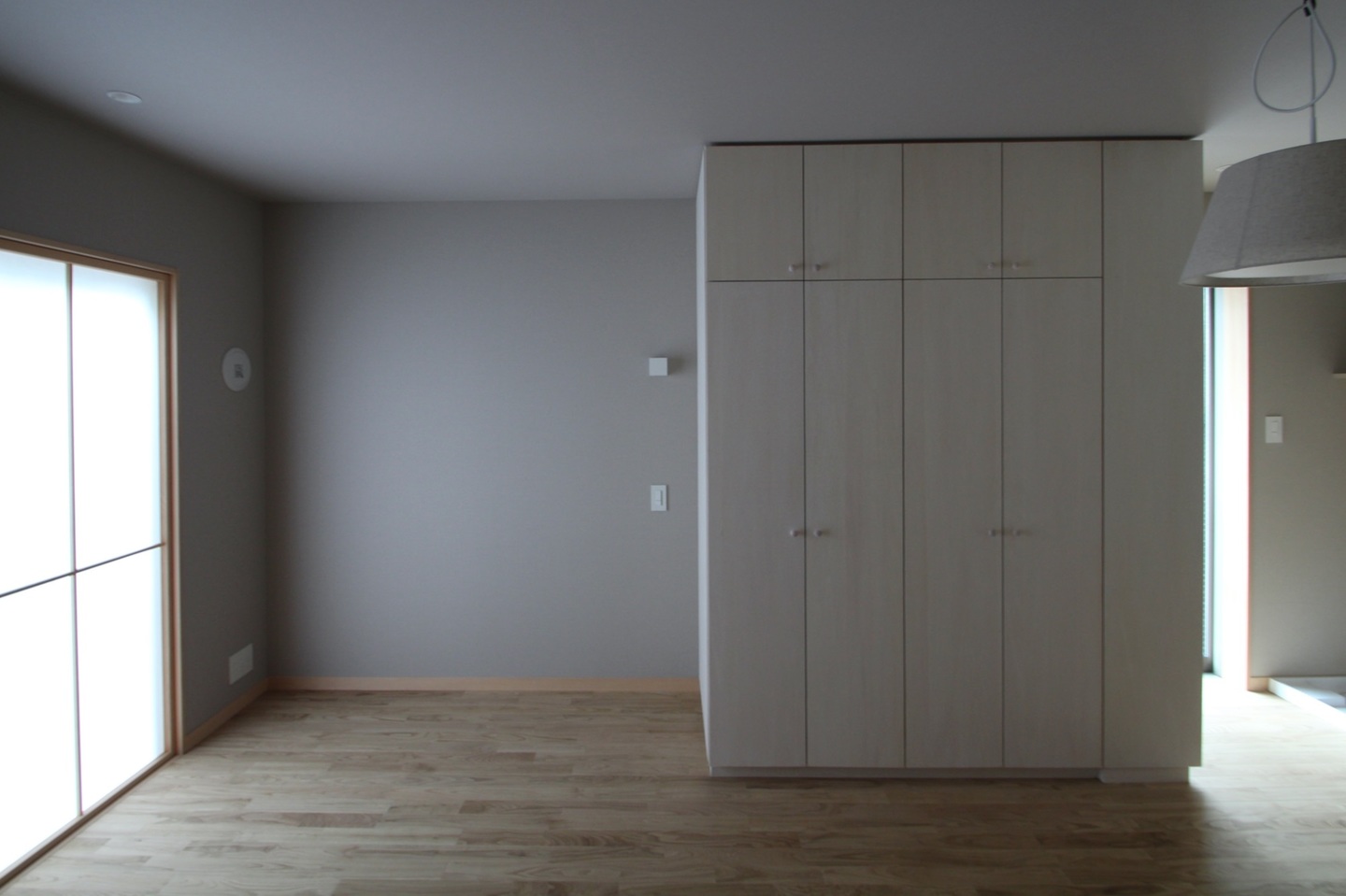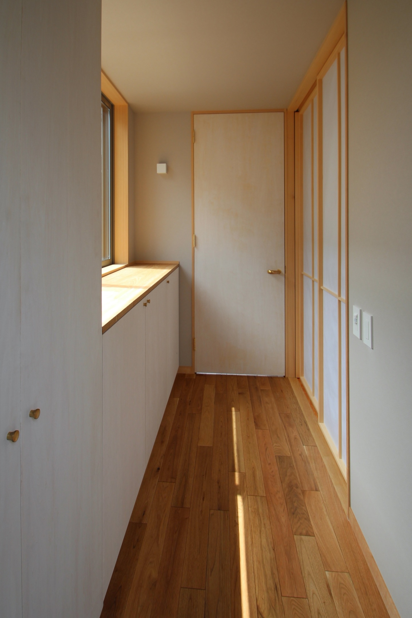 2階は、Kさん夫妻のシンプルでコンパクトな住まいだ。約52㎡(約15.7坪)の中に、お二人の希望されている広さがとれるように、工夫した。廊下を設けずに部屋と部屋をつなぐ空間構成とする事で、個々の部屋の広さを最大限に確保している。