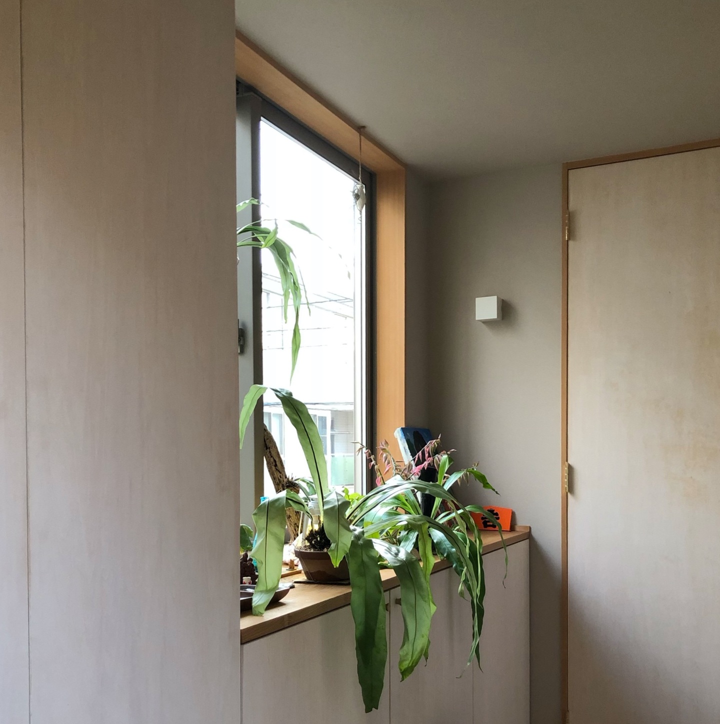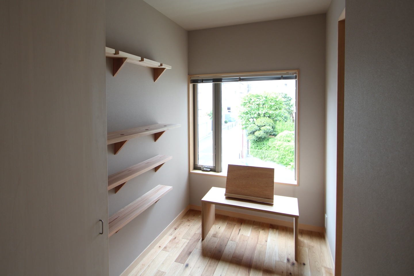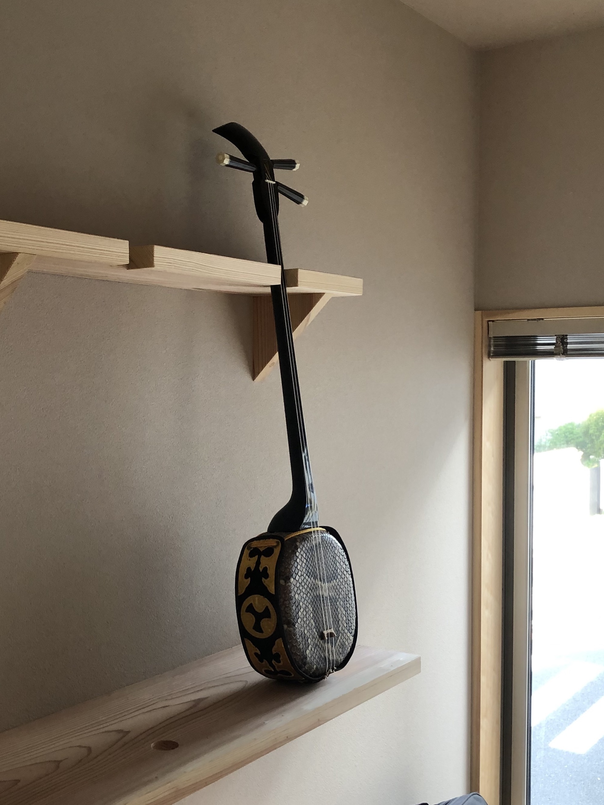 奥様は三線を弾きながら歌う琉球古典音楽をやっている。料理の合間でも稽古を行うということで、キッチンの隣に稽古場を配置した。演奏は床に直に正座するので、座った目線の高さに開口部を設け、借景の緑を眺められるようにした。稽古場は約3畳の省スペースであるが、開口部により空間の広がりが感じられる。稽古にも集中できると言う。