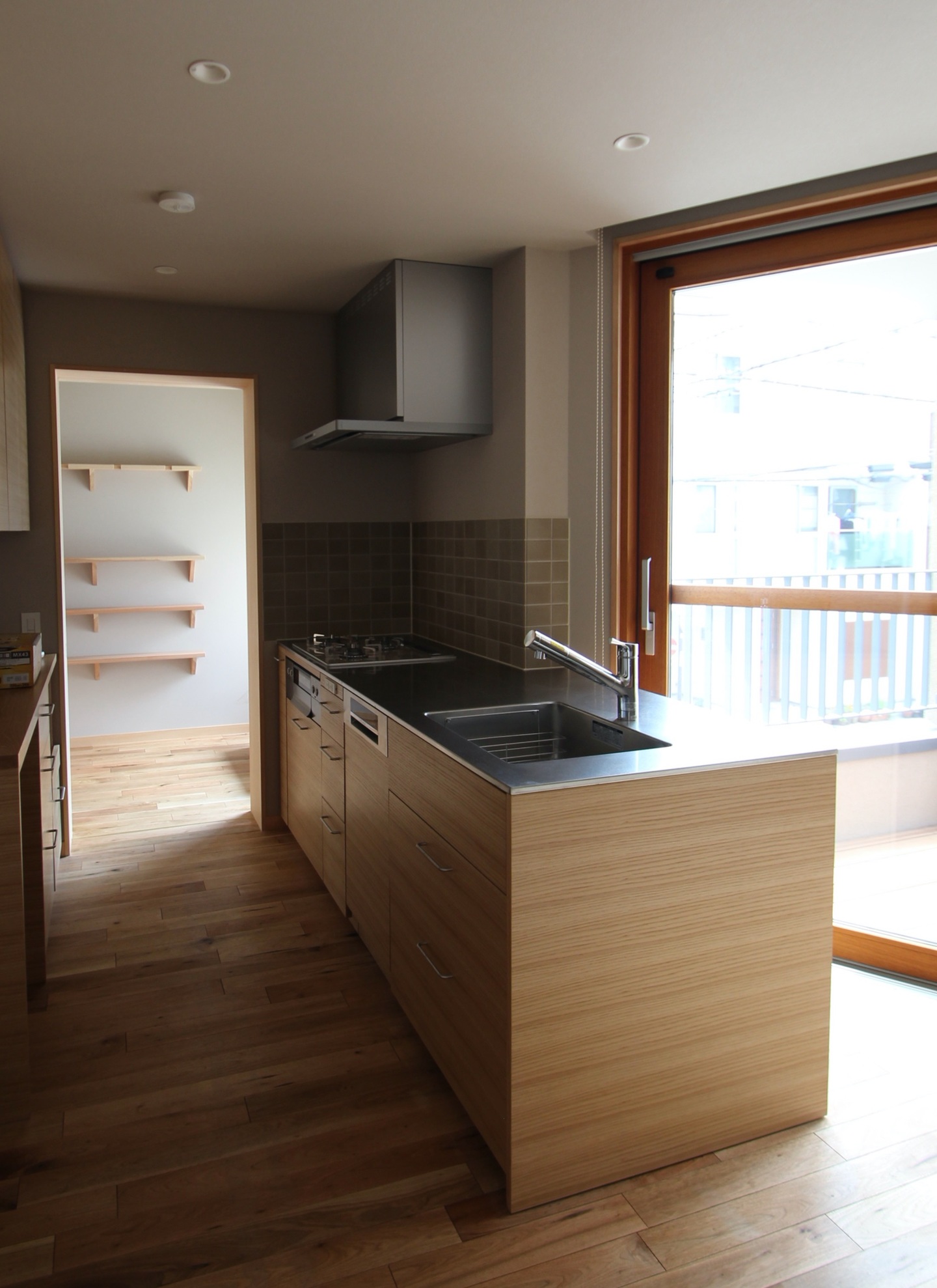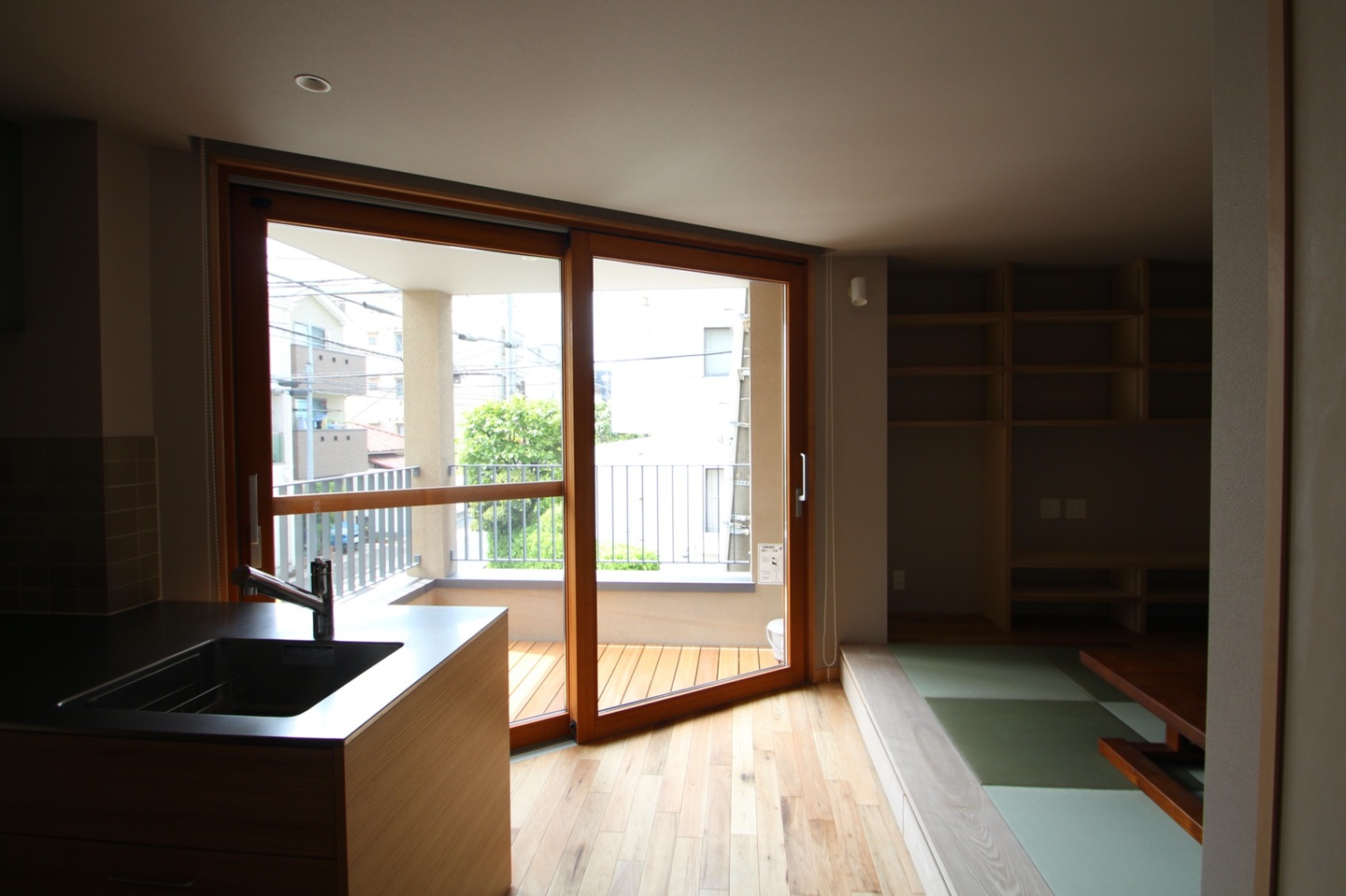 外からの視線を気にするより、中の開放性を優先したいというKさん。角地の交差点に向けた大きめの木製サッシは視線の抜けをもたらしコンパクトな住まいに奥行きを与えている。キッチンに立った時も視線は外へと抜ける。室内とつながりを意識したウッドデッキバルコニーに椅子を並べ、毎夕、風呂上がりのビールを楽しんでいるそうだ。