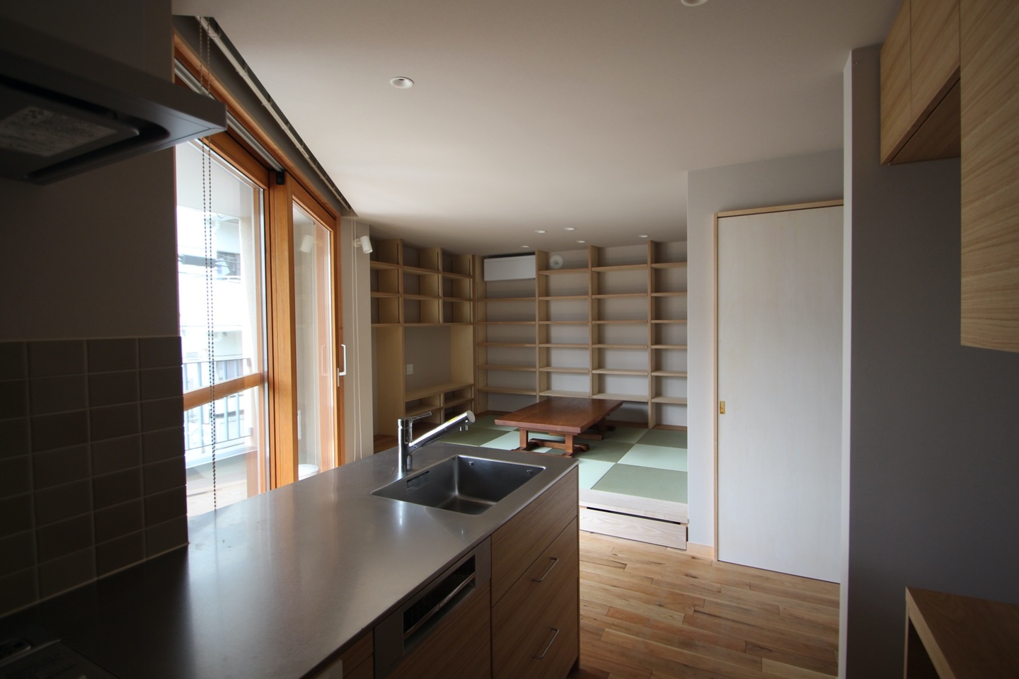キッチンとつながるリビングは琉球畳6畳ほどの小上がりとなっている。仕事、くつろぎ、食事などいろいろ用途の場となる。