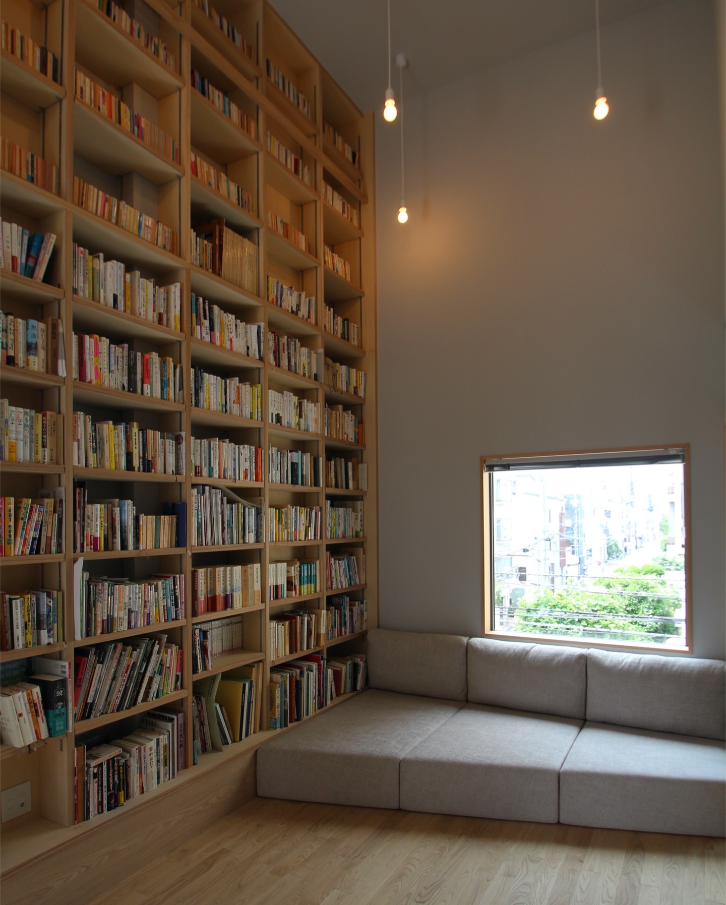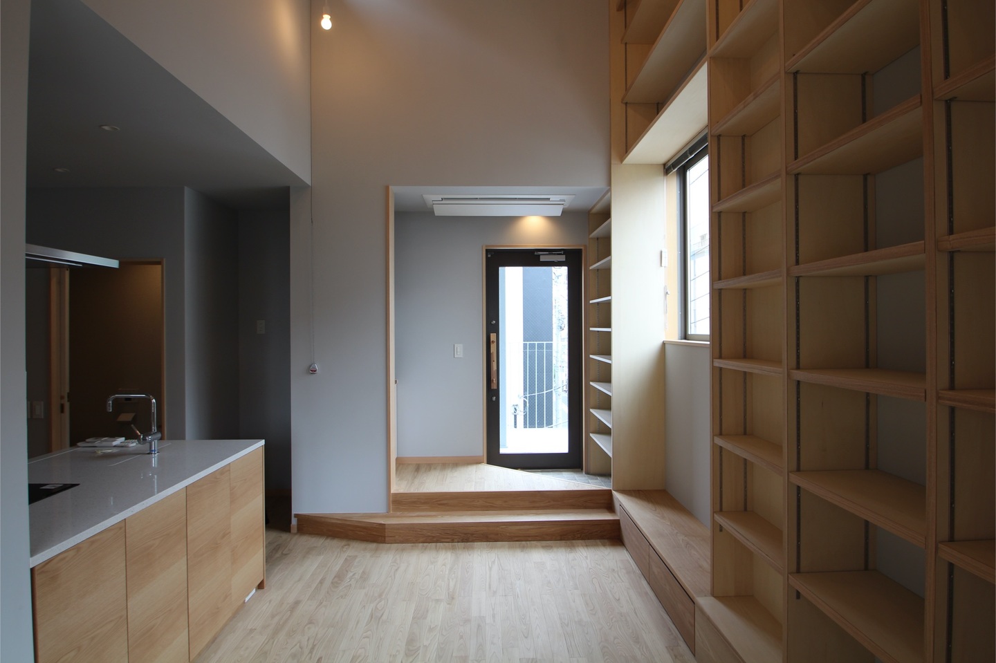そして3階は、Kさんご自身で教える学習塾のフロアだ。扉を開けると、入った時のワクワク感を大事にしたいというKさんの思いを形にしたホワイエがある。天井高さ4.5m。壁一面の本棚。ワイワイ集まれるキッチン。様々なところでくつろげる段差やソファのある空間とした。