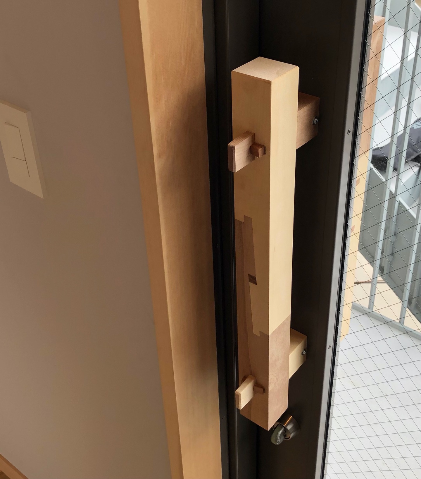 入口ドアのハンドルも入る時のワクワク感を演出する棟梁製作の木組みのものとした。外側は追掛大栓継、内側は金輪継という木組みの名称。塾の生徒さん達に、職人さんの技を感じらるものをデザインできた。